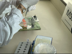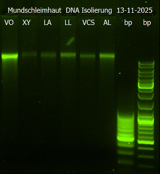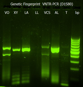 Mittags konnten dann alle Schülerinnen und Schüler sicher mit hochwertigen Pipetten, Vortex Schüttlern und Zentrifugen umgehen. Nach einer kurzen Mittagspause durfte dann geübt werden, die amplifizierten DNA-Proben in eine Gelelektrophorese zu pipettieren. Die größte Ausbeutung an DNA hatte die Gruppe VO, wie wir nach der Auftrennung in der Gelelektrophorese unter dem UV-Licht sehen konnten. Anhand des VNTR-Abschnitts des 1. Chromosoms konnten wir einen genetischen Fingerprint erstellen. Da der Kursleiter vorher die Probe einer Gruppe heimlich entwendet hatte, konnten wir auch die Gruppe VCS eindeutig als Täter identifizieren.