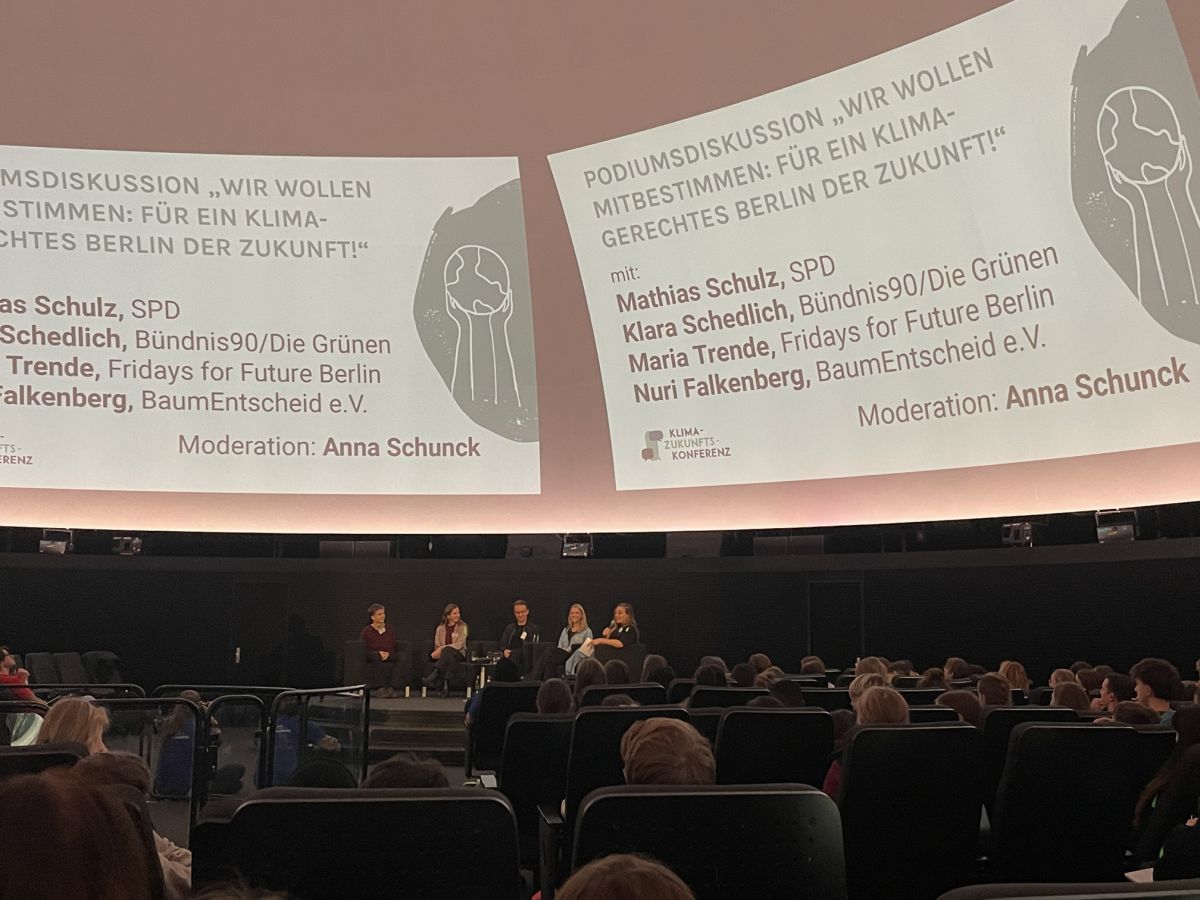 Nach einer stärkenden Mittagspause, bei der die 3Köche ein kostenfreies vegetarisches bzw. veganes Lunchpaket für alle Teilnehmenden angeboten haben, begann die Podiumsdiskussion zum Thema „Wir wollen mitbestimmen: Für ein klimagerechtes Berlin der Zukunft!“. Anna Schunck moderierte sehr zugewandt und verstand es gut, die Fragen der Jugendlichen an Mathias Schulz (SPD), Klara Schedlich (Bündnis 90/ Die Grünen), Maria Trende (FFF Berlin) und Nuri Falkenberg (BaumEntscheid e.V.) weiterzugeben.