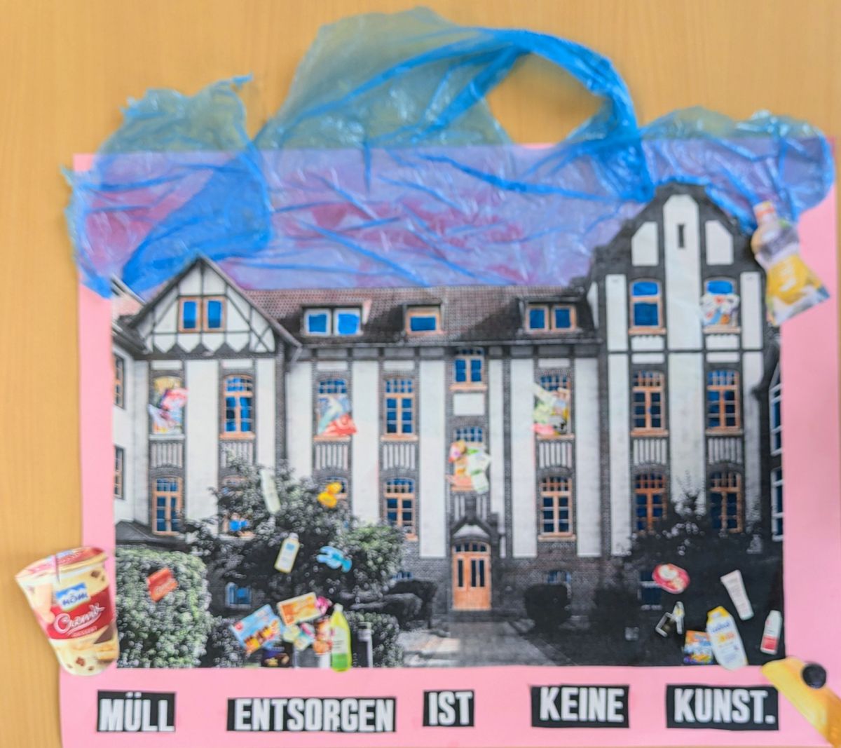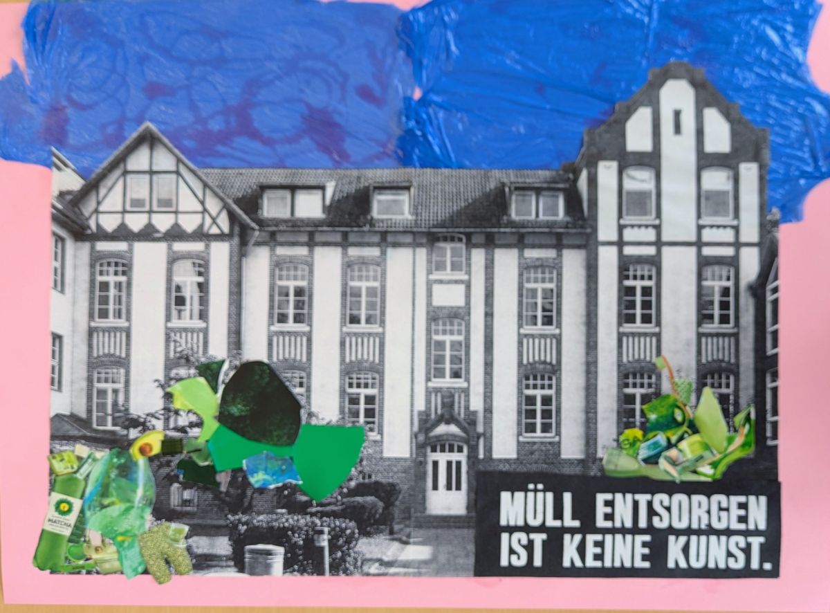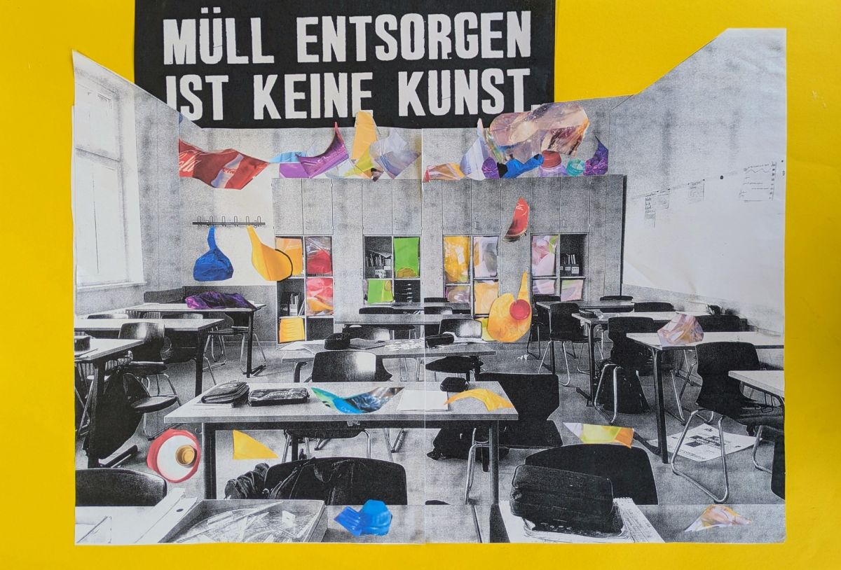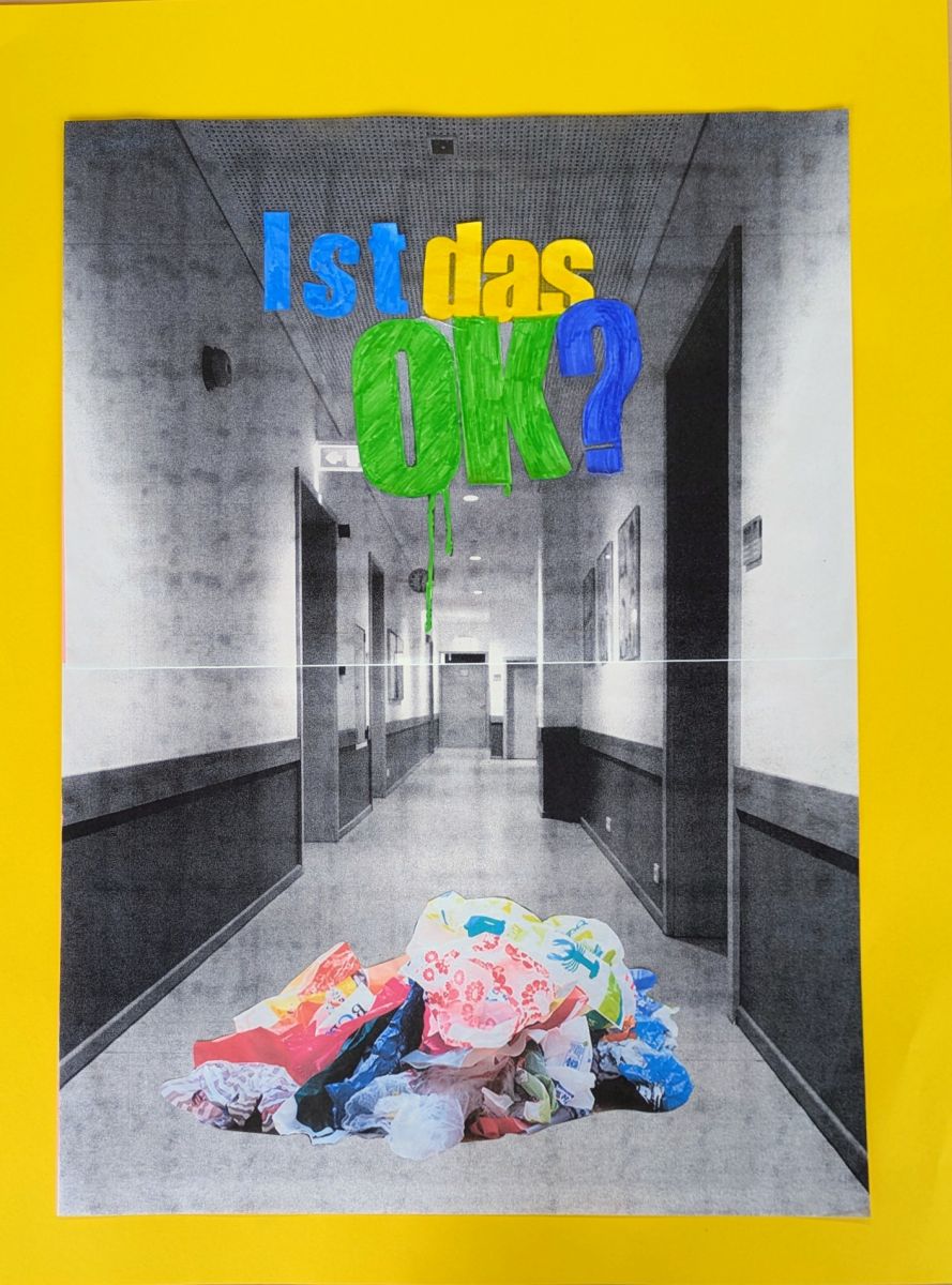 Begleitend dazu fand – wie jedes Jahr – eine inhaltliche Auseinandersetzung mit der Plastikproblematik statt. So setzten sich die Schüler:innen der Klasse 8m im Kunstunterricht kreativ mit der Vermeidung von Plastikmüll im Schulalltag auseinander. Dabei entstanden Plakate, die mithilfe von Verfremdung und Übertreibung typische Werbestrategien aufgriffen und kritisch hinterfragten.